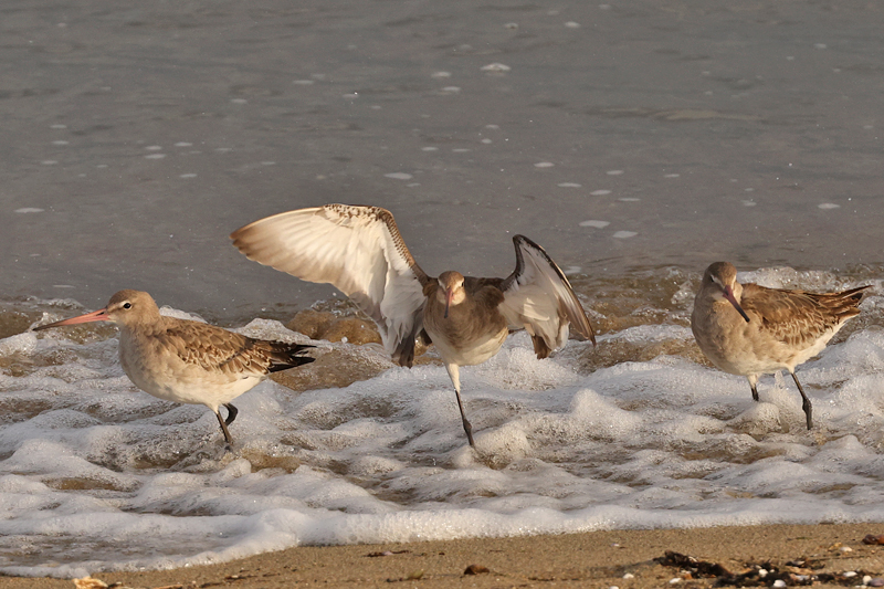 河口もカモたちが増えてきて、シギチたちはカモに埋もれそうでした 1枚目;オグロシギ幼鳥 冬羽が出っています 2枚目:オオソリハシシギ幼鳥 3枚目:ホウロクシギ幼鳥 4枚目:ミユビシギ成鳥冬羽